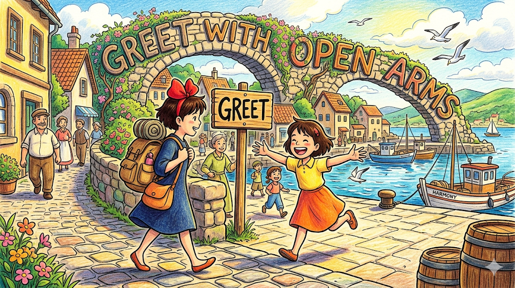 greet with open arms, greet with a smile, greet the day