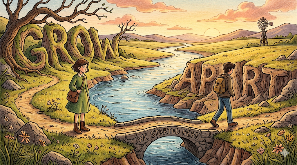 - grow apart → 점점 멀어지다 (싸운 게 아니라 자연스럽게 서로 달라져 멀어지는 것)