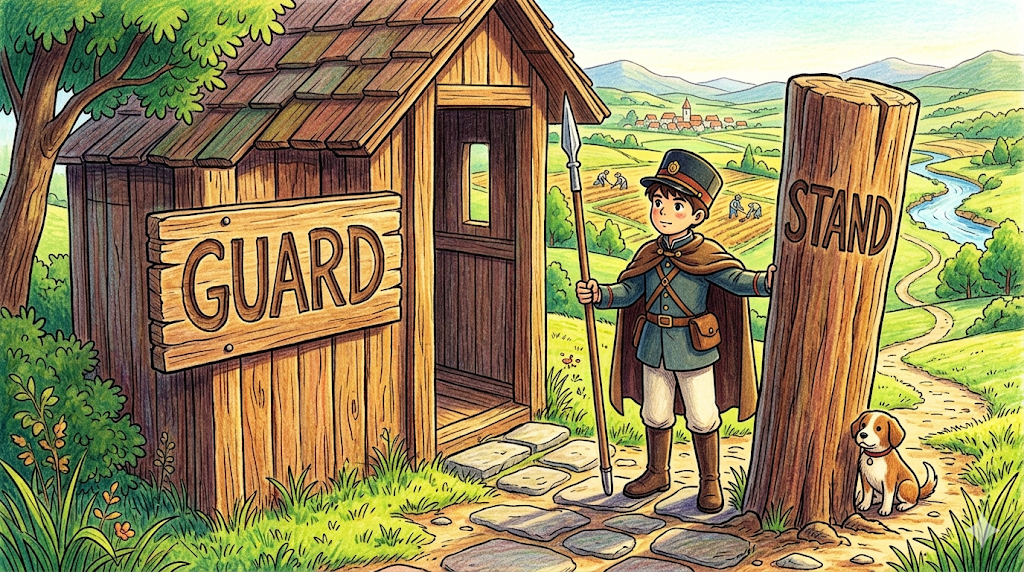 - Guard duty tells you when to be there, stand guard tells you where to be, and keep guard tells you how long to stay — together, they build a wall of care around what matters most. (경비 임무는 언제 그곳에 있어야 하는지를 알려주고, 보초를 서는 것은 어디에 있어야 하는지를 알려주며, 경비를 유지하는 것은 얼마나 오래 있어야 하는지를 알려준다 — 함께 이 세 가지는 가장 중요한 것 주변에 보호의 벽을 쌓는다.)
