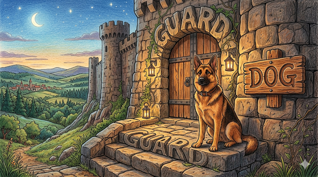 (일상/사회) "경비견, 집을 지키는 개"를 뜻합니다. 집이나 건물을 지키기 위해 키우는 개를 가리킵니다.