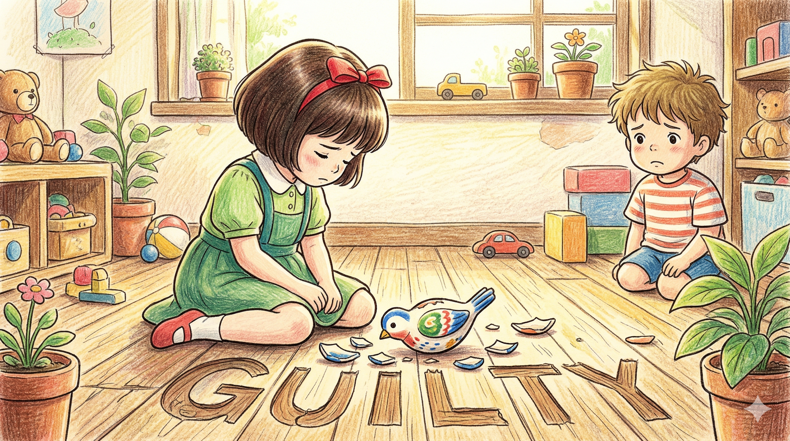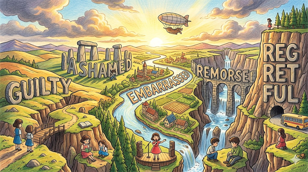 | guilty | 잘못·수치 | 특정 행동에 대한 도덕적 책임감 | She felt guilty for losing her friend's book. |