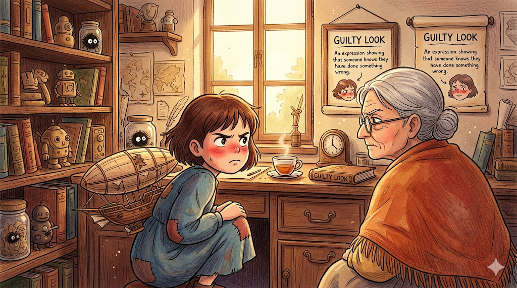 | guilty look | 죄책감이 담긴 표정 | 잘못을 얼굴로 드러내는 표정 |