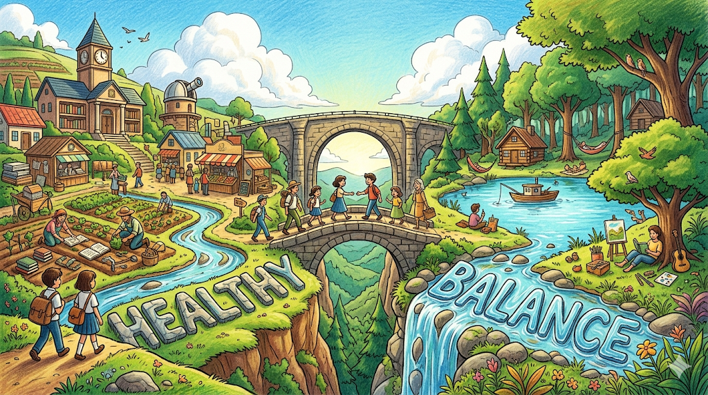 공부와 휴식, 일과 여가 등 서로 상반되는 요소들 사이의 적절한 균형을 뜻합니다. 어느 한쪽에 치우치지 않는 것이 핵심입니다.