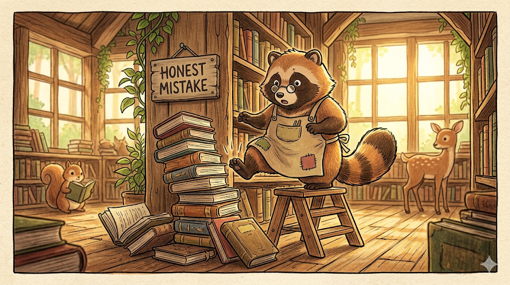 (일상/사회/수능) "악의 없는 실수, 순수한 착오"를 뜻합니다. 의도적으로 잘못한 것이 아닌, 모르거나 착각해서 생긴 실수임을 강조합니다.