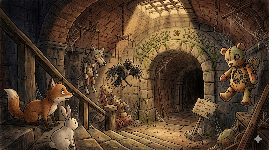 - chamber of horrors → 끔찍한 것들이 가득한 공간. 원래는 밀랍 인형관의 공포 전시실을 뜻했지만, 비유적으로도 씀