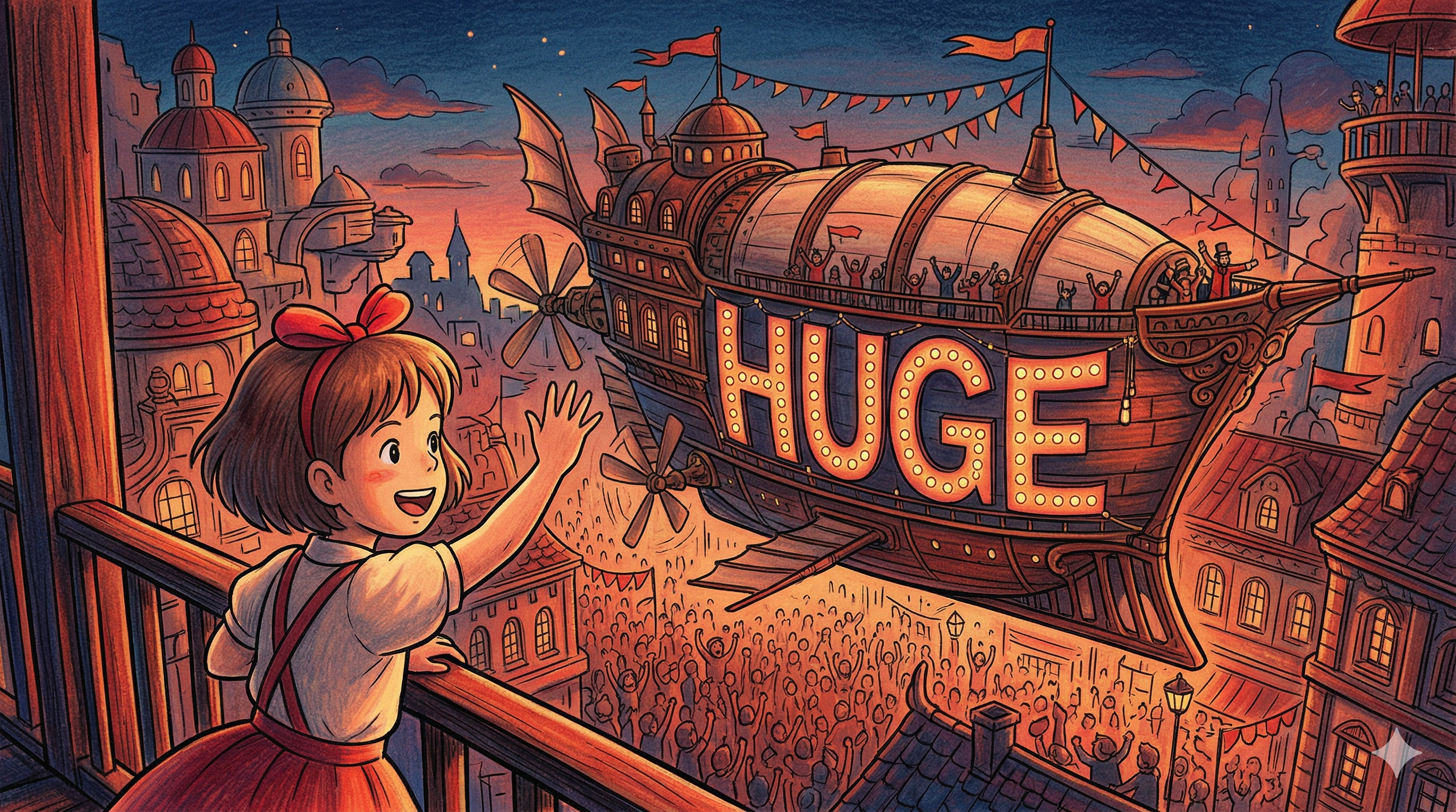 - huge → "엄청나게 큰, 거대한" — big이나 large보다 훨씬 강렬한 크기의 표현. 물리적 크기뿐 아니라 규모·영향·감정에도 두루 씀. "The crowd at the concert was huge." (콘서트의 관중은 엄청났어.)