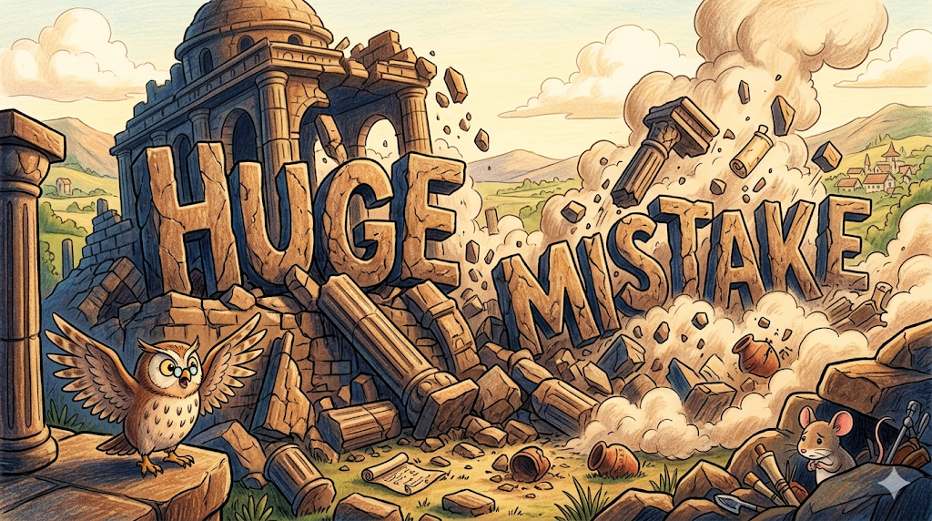 - huge mistake → 엄청난 실수·중대한 오류. 단순한 실수가 아닌 심각한 결과를 낳은 잘못. "Ignoring the warning signs was a huge mistake." (경고 신호를 무시한 것은 엄청난 실수였어.)