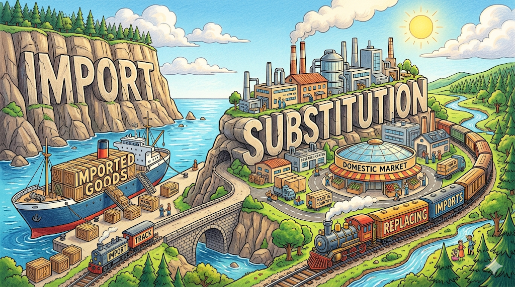 (경제/학술/수능) "수입 대체"를 뜻합니다. 수입에 의존하던 것을 국내에서 직접 만들어 대체하는 경제 전략을 나타냅니다.