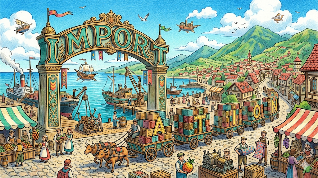 🌟 초등학생 버전 import는 우리나라에서 만들지 않는 바나나를 다른 나라에서 배로 실어오는 것처럼, 다른 나라의 물건을 우리나라로 가져오는 것을 뜻하는 단어예요! import duty는 그 물건을 들여올 때 나라에 내는 세금이에요! 🚢✨