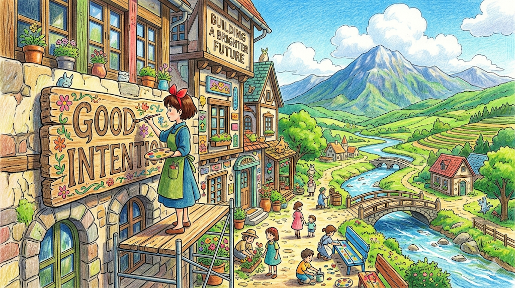 - good intentions → 선한 의도, 좋은 뜻 — 하지만 결과가 나쁠 수 있다는 뉘앙스로도 자주 쓰임 ("The road to hell is paved with good intentions." 지옥으로 가는 길은 선의로 포장되어 있다)