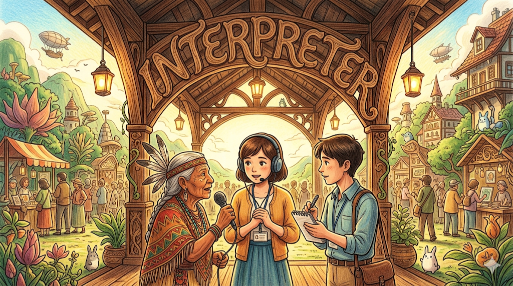 서로 다른 언어를 사용하는 사람들 사이에서 말을 실시간으로 옮겨주는 사람, 또는 어떤 것의 의미를 풀어내는 사람을 나타냅니다. 수능 독해 일상·사회·예술 지문에서 자주 등장합니다.