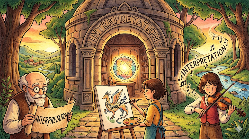 'interpret'는 라틴어 interpretari(설명하다, 번역하다)에서 유래했으며, interpres(중개인, 설명자)와 연결됩니다. 어원의 핵심 이미지는 "두 세계 사이에서 의미를 중개하고 전달하는 것" 으로, 단순한 번역이 아닌 한 세계의 의미를 다른 세계가 이해할 수 있는 형태로 풀어내는 능동적인 행위가 이 단어의 본질입니다.