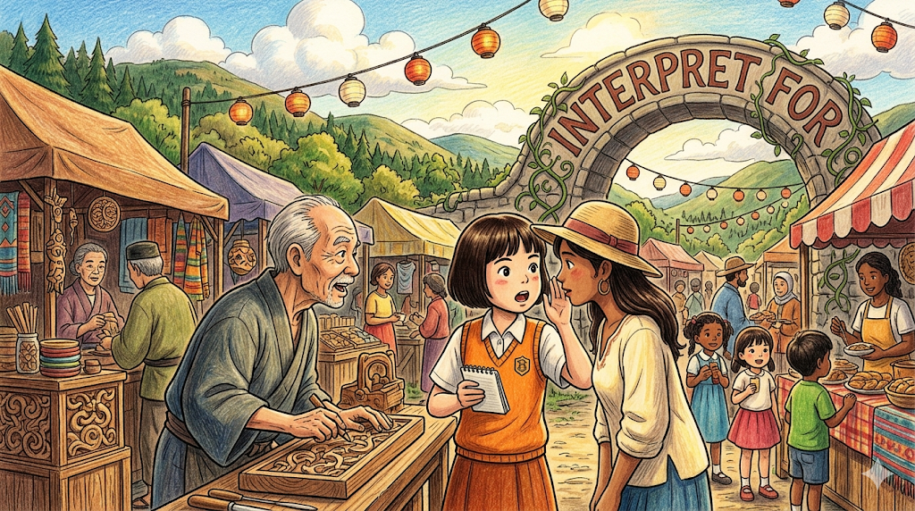 | interpret for | ~을 위해 통역하다 | 서로 다른 언어 사이에서 말을 옮겨주는 것 |