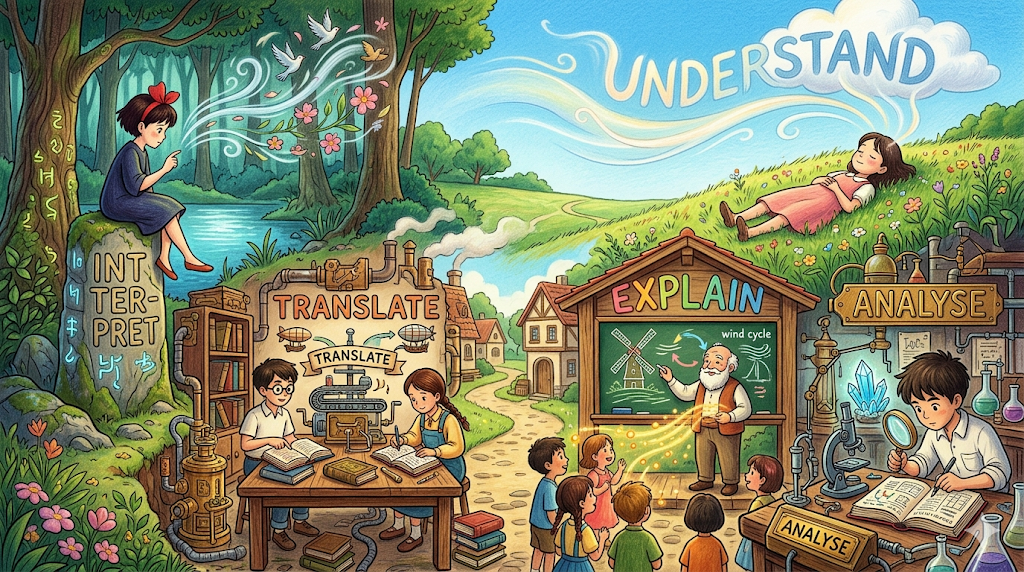 (일상/문학/수능) "해석, 이해, 통역, 표현"을 뜻합니다. 어떤 것의 의미를 풀어내는 행위나 그 결과를 나타내며, 예술·문학·언어·상황 등 다양한 맥락에서 쓰입니다.