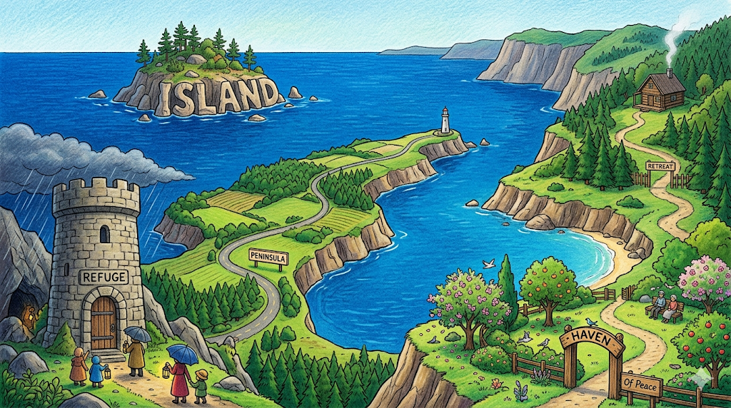 ✨ 최종 한 줄 요약 island는 지리적 섬에서 출발해 평화의 피난처·절망 속 희망·폐쇄적 사고·인간 연결의 필요성까지, 고립과 연결의 역설을 모두 담은 단어다.