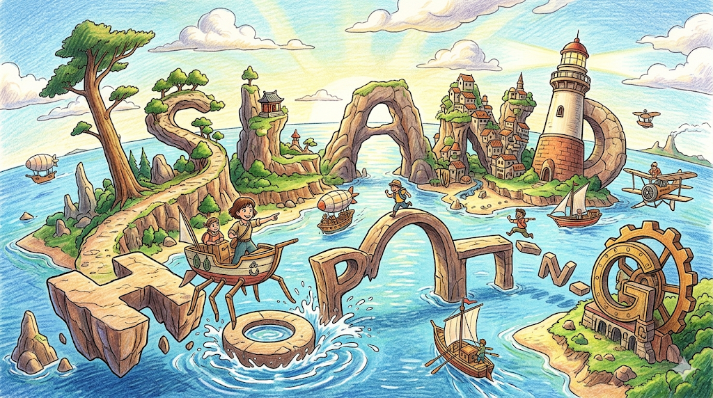 한 섬에서 다른 섬으로 이동하며 여러 섬을 여행하는 것을 강조하며, 비유적으로 여러 장소나 상황을 빠르게 옮겨 다니는 것을 나타내기도 합니다. 수능 독해 사회·여행 지문에서 자주 등장합니다.