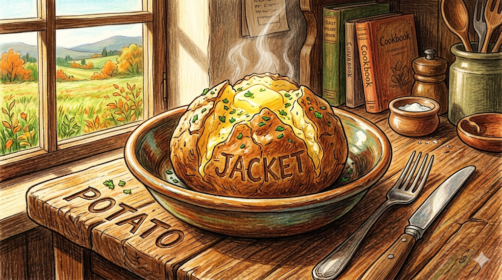 (일상/문화/수능) "재킷 감자, 껍질째 구운 감자"를 뜻합니다. 감자를 껍질째 오븐에 구운 요리를 나타내며, 감자의 껍질이 jacket처럼 안을 감싸고 있다는 이미지에서 왔습니다.
