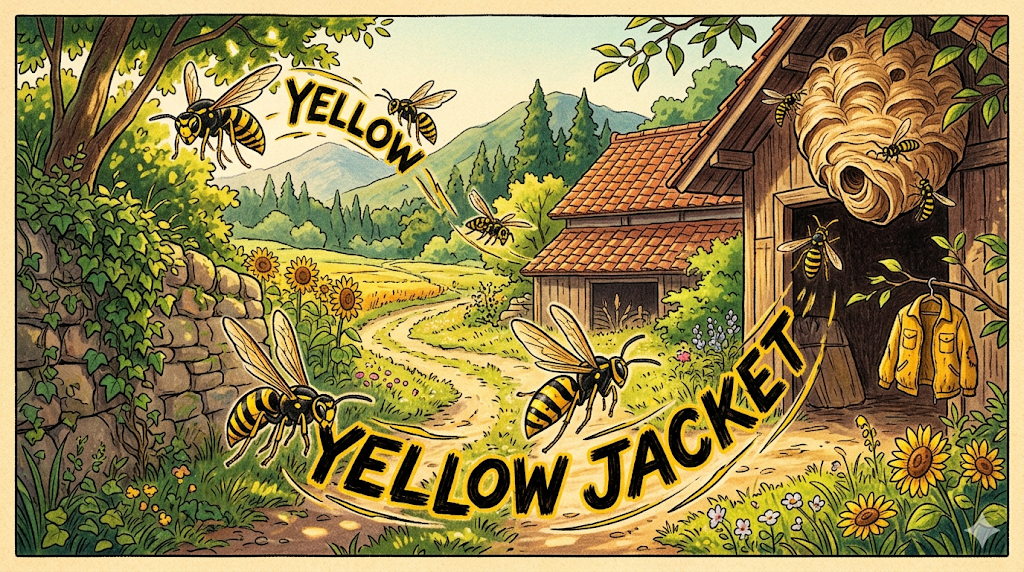 - yellow jacket → 말벌·노란 조끼. 주로 미국에서 노란색과 검은색 줄무늬를 가진 공격적인 말벌을 가리킴. 노란 조끼(vest)를 의미하기도 함. "Watch out — there's a yellow jacket nest near the back door." (조심해 — 뒷문 근처에 말벌 집이 있어.)