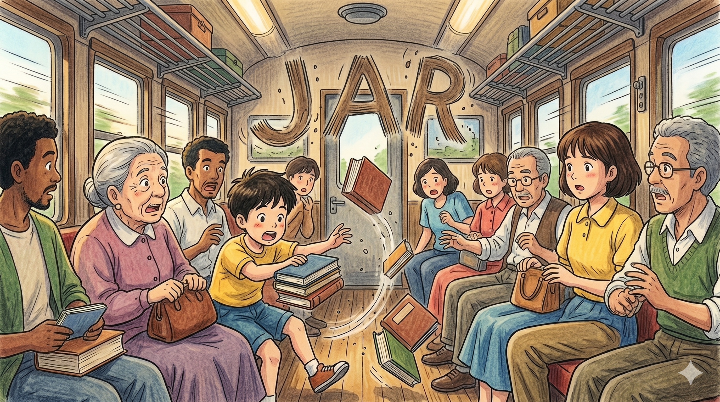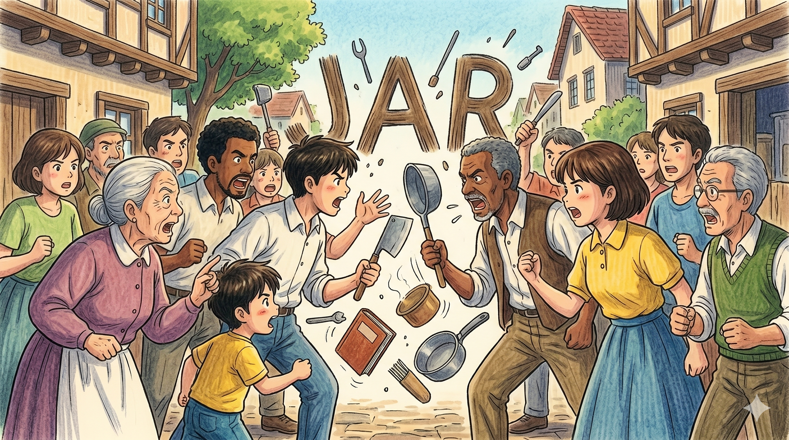 jar는 단순히 "병"이 아니라, 아랍어 jarrah(흙 항아리)와 중세 영어의 삐걱거리는 소리라는 두 갈래의 어원에서 출발해 넓은 입구의 단단한 용기에서 신경 거슬리는 불쾌함·불협화음·어울리지 않음·충격적 경험까지 확장되는 단어다 — jar가 있는 곳엔 언제나 '단순한 용기가 아닌, 무언가를 담아두거나 불쾌하게 삐걱거리며 신경을 건드리는' 용기와 불쾌함의 선언이 있다.