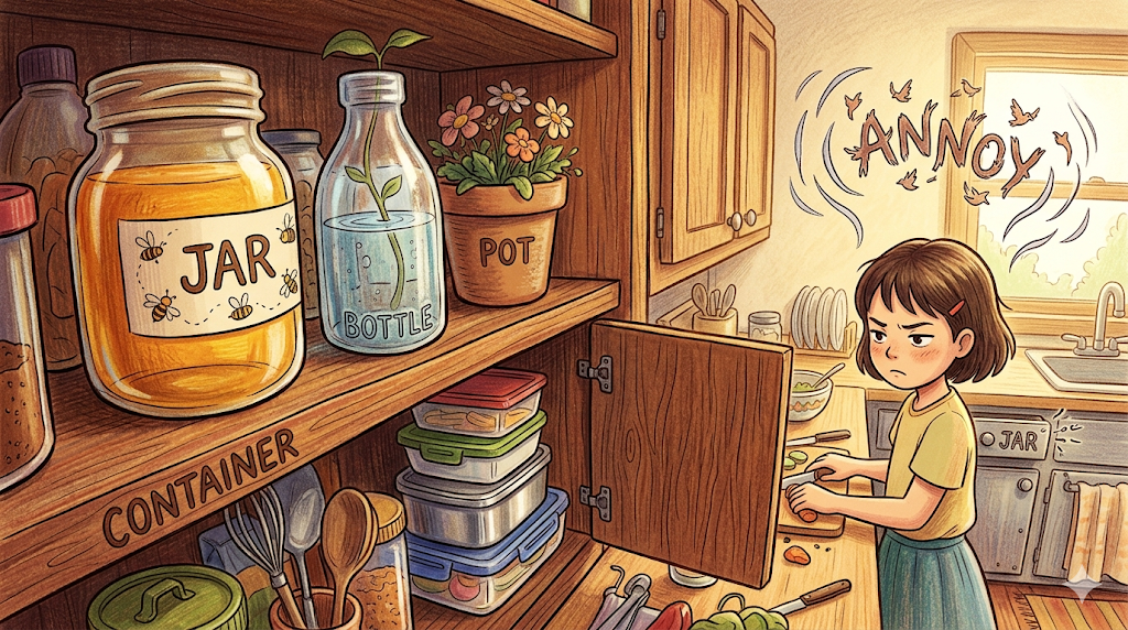 🌟 초등학생 버전 jar는 할머니 집 주방에 있는 꿀이 든 유리병처럼, 넓은 입구를 가진 단단한 병을 표현하는 단어예요! 그런데 jar는 "신경을 거슬리다"라는 뜻도 있어서, 누군가가 계속 삐걱거리는 소리를 낼 때 **"That really jars on my nerves!"**라고 말할 수 있어요! 🫙✨