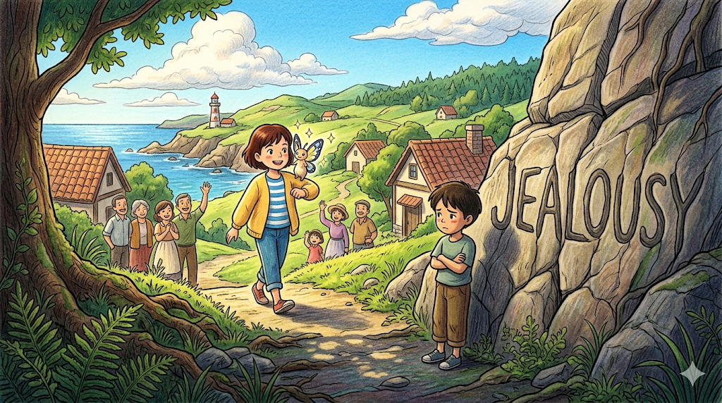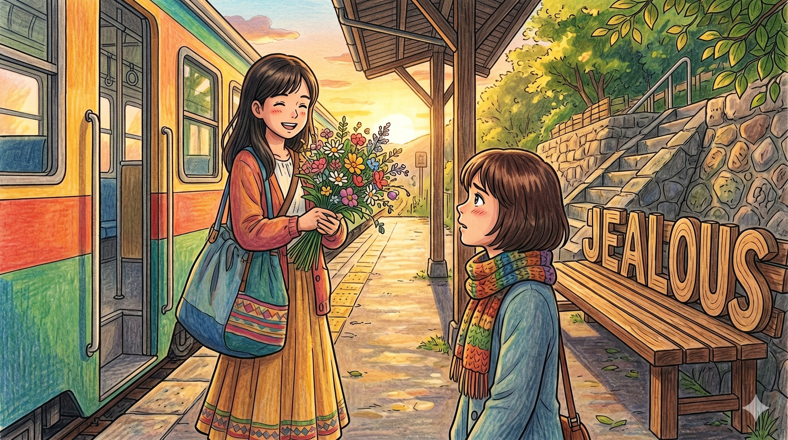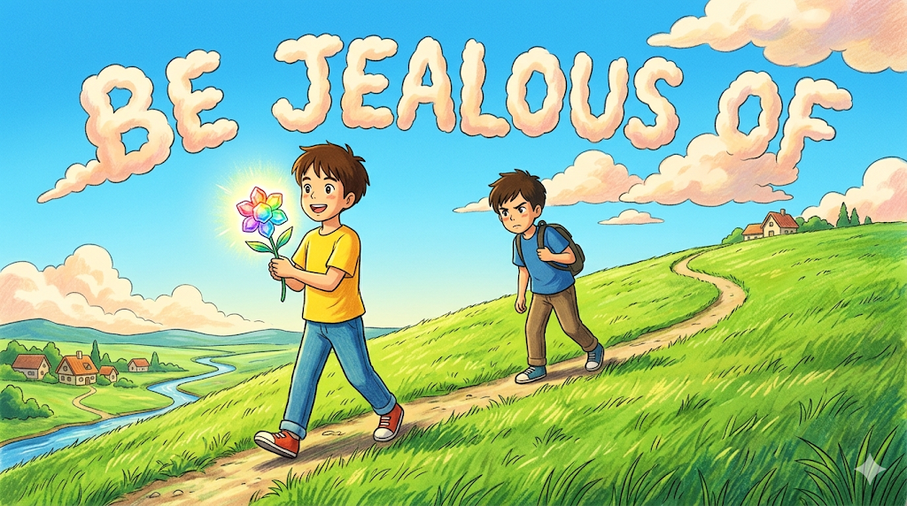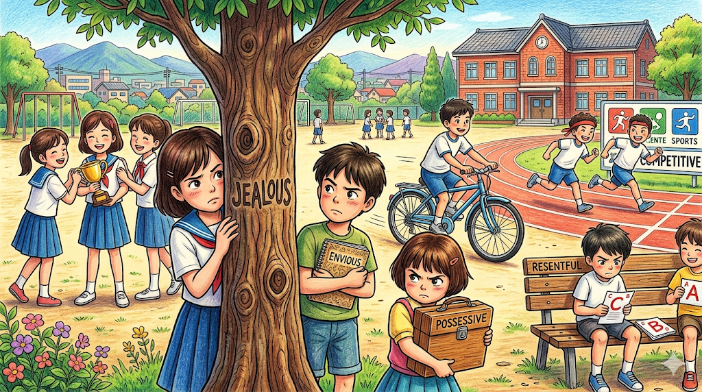 🌟 초등학생 버전 jealous는 친구가 내가 갖고 싶었던 장난감을 선물로 받았을 때 배가 아프고 부럽고 억울한 그 복잡한 기분을 표현하는 단어예요! green with jealousy는 질투심이 너무 심해서 얼굴이 초록색으로 변할 것 같은 느낌이에요! 💚✨