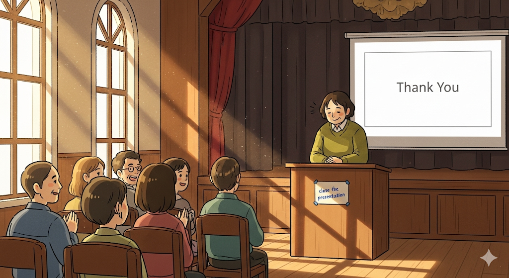 - *'close the presentation'**은 발표를 성공적으로 마무리하는 공식적인 표현입니다.