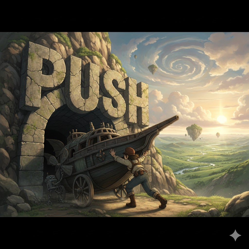 - *'push'**는 **'어떤 대상을 자기에게서 멀어지도록 힘을 가하거나, 어떤 것을 시작하거나 진행시키기 위해 압력을 가하는 것'**이라는 핵심 뉘앙스를 가집니다. 이는 물리적인 **'밀침'**의 행위뿐만 아니라, **'버튼 조작, 특정 상황으로의 유도, 그리고 비유적인 압박이나 노력'**까지 포함하여 **'힘을 통한 이동, 시작, 또는 변화 유도'**의 의미를 포괄합니다.