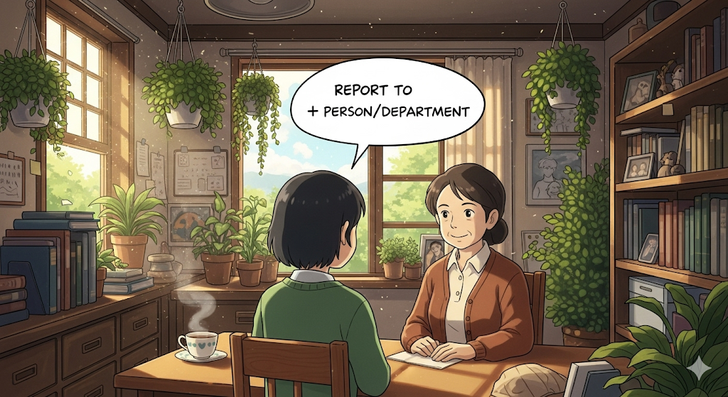 report to + 사람/부서 [rɪˈpɔːrt tuː + ˈpɜːrsən/dɪˈpɑːrtmənt]