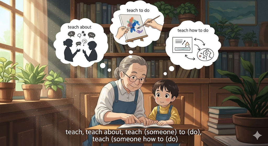 'teach'는 교육의 가장 기본적인 동사이며, 'about', 'to do', 'how to do' 등과 함께 가르치는 내용과 방식을 구체화합니다.
