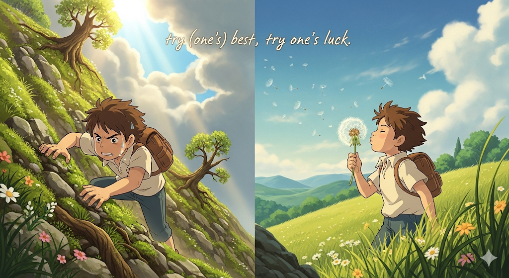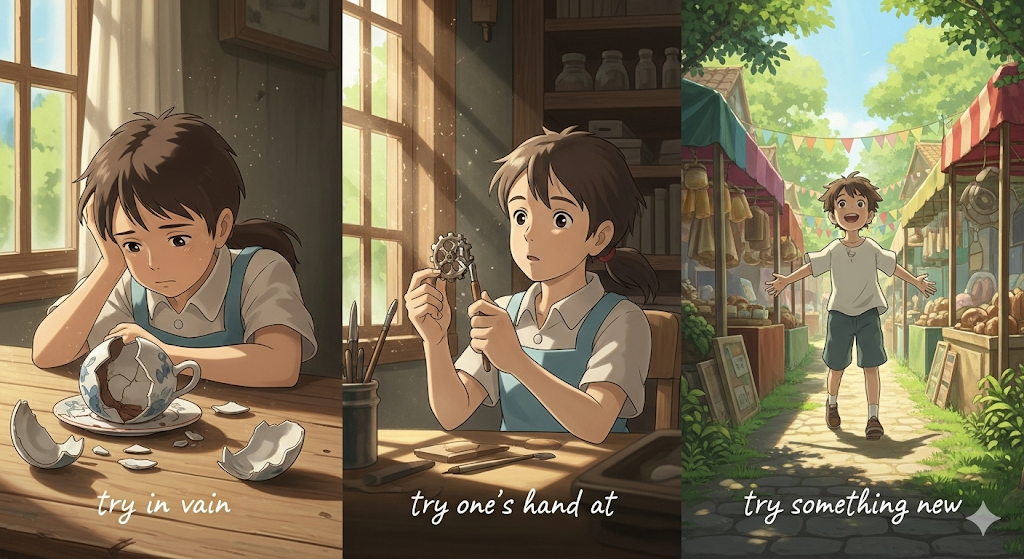 이 표현들은 시도의 '태도'나 '결과'를 나타내는 숙어입니다. try one's best는 '최대한의 노력'을 쏟는 것을 강조합니다. try one's luck은 '운에 맡기고' '모험적으로 시도하는' 것을 의미합니다. try in vain은 '아무런 소용없이' '헛되이 노력하는' 것을 나타냅니다. try one's hand at은 '새로운 활동이나 취미를' '처음으로 시도해보는' 것을 뜻합니다. try something new는 '기존에 해보지 않았던' '새로운 경험을 시도하는' 것을 의미합니다.