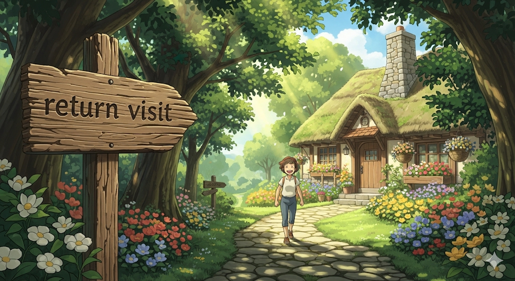 '이전에'(former) '방문'(visit)했던 '장소'(place)나 '사람'(person)을 '다시'(return) '찾아가는' 행위를 의미합니다. '답례'나 '후속'(follow-up) '조치'(action)를 '목적'(purpose)으로 하는 '재방문'을 강조하며, '관계'(relationship)의 '지속'(continue)을 나타냅니다.