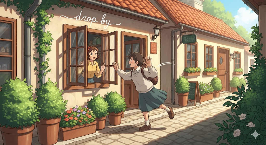 'drop by'와 유사하게, '예고'(notice) 없이 '다른' 사람(person)의 '집'(home)이나 '직장'(work)에 '잠깐'(briefly) '방문'(visit)하는 행위를 의미합니다. '사전'(advance) '계획'(plan) 없이 '우발적으로'(accidentally) '방문'하는 '친근한'(friendly) 행위를 강조합니다.