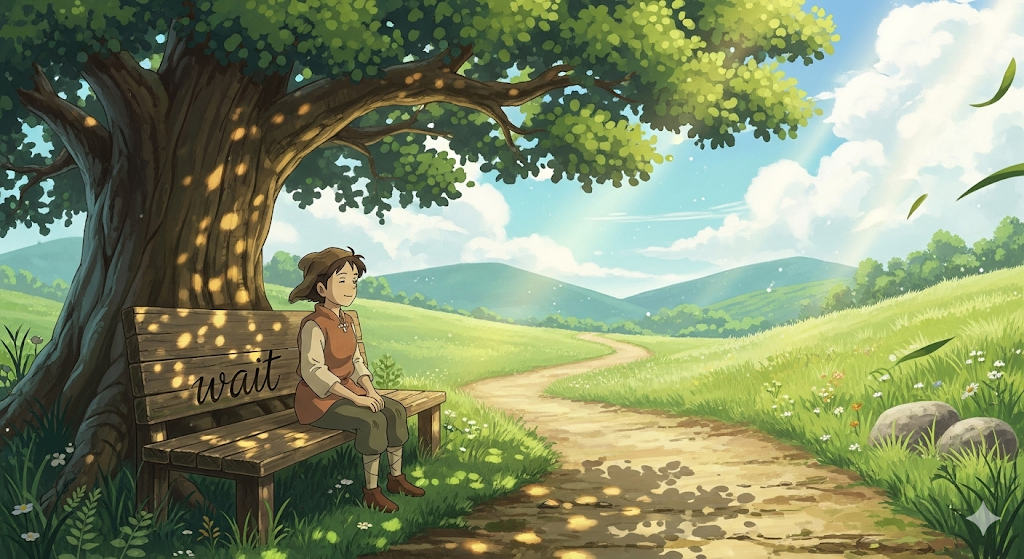 '미래'(future)의 '결과'(outcome)나 '결말'(end)에 대해 '판단'(judgment)이나 '결정'(decision)을 '내리지'(make) 않고, '시간'(time)이 '지나면서'(pass) '상황'(situation)이 '어떻게'(how) '전개'(unfold)될지 '기다려'(wait) '지켜보는'(see) 행위를 의미합니다. '불확실성'(uncertainty)을 '수용'(accept)하고 '성급함'(rashness)을 '피하는'(avoid) 태도를 강조합니다.