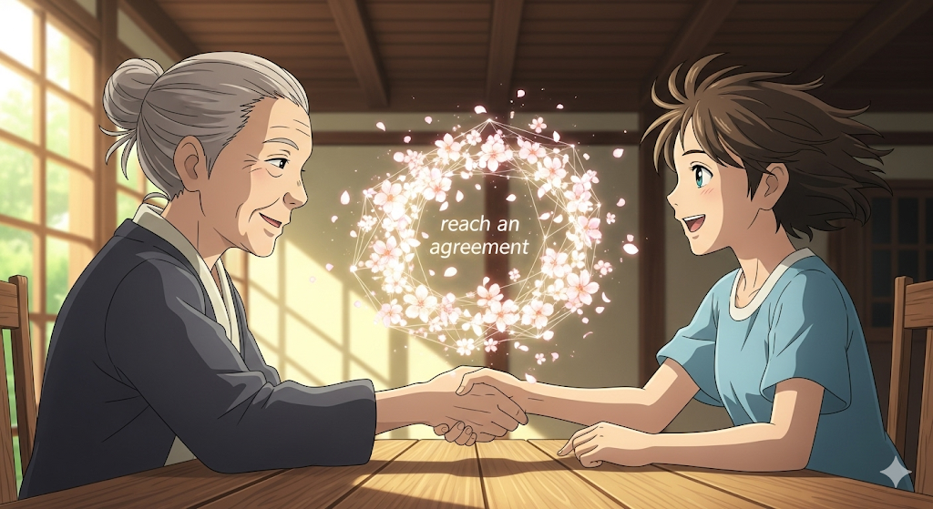 '둘'(two) 이상의 '당사자'(parties)가 '특정'(specific) '주제'(subject), '조건'(terms), 또는 '계획'(plan)에 대해 '상호'(mutual) '이해'(understanding)를 '바탕'(basis)으로 '동의'(consent)하고 '약속'(promise)을 '맺는' '공식적'(official) 또는 '비공식적'(informal)인 '상태'(condition)나 '문서'(document)를 의미합니다. '분쟁'(dispute) '해결'(solve)과 '협력'(cooperation)의 '기반'(foundation)을 강조합니다.