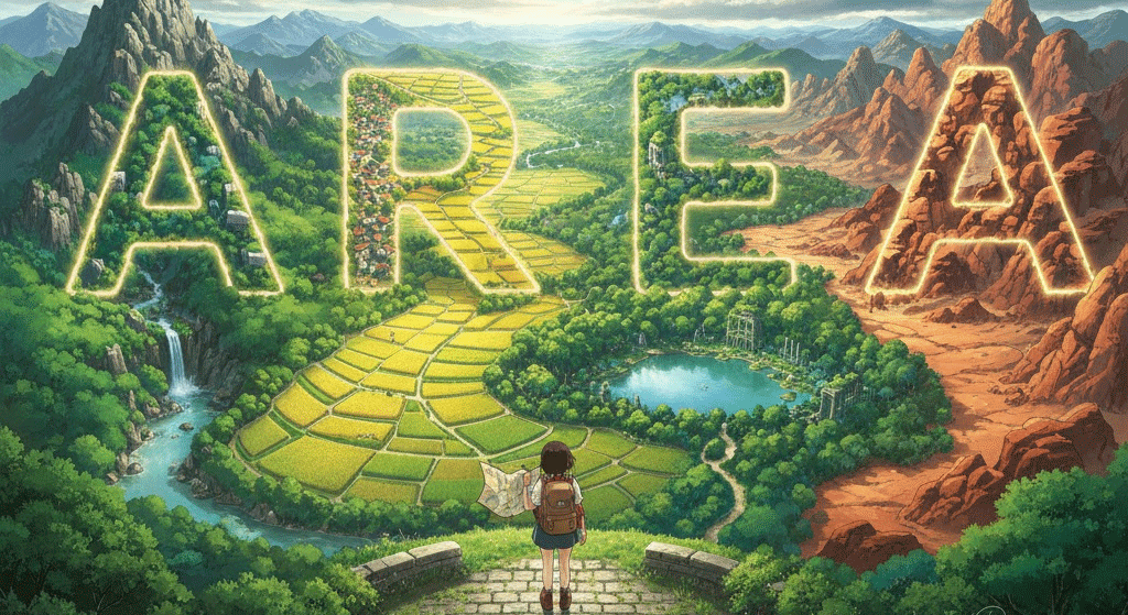 라틴어 area ("빈터, 마당, 경작지")에서 유래 → 원래 **'특정 용도로 사용되는 평평한 공간'**을 의미했음 → 이 의미가 현대 영어에서 '특정한 목적이나 특징을 가진 지리적 공간' (지역, 구역) 명사로 발전함. 나아가 이러한 공간의 '크기나 넓이' (면적), 그리고 추상적인 개념으로서 '특정 주제나 활동의 범위' (분야, 영역)를 나타내게 되었어요. 즉, **'물리적인 공간의 일부, 그 공간의 크기, 또는 추상적인 활동 범위를 나타내는 다양한 형태의 개념'**을 나타내는 핵심 단어예요.