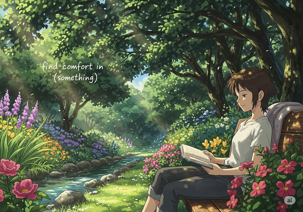- 뜻: ~에서 위안을 얻다, 위로를 받다