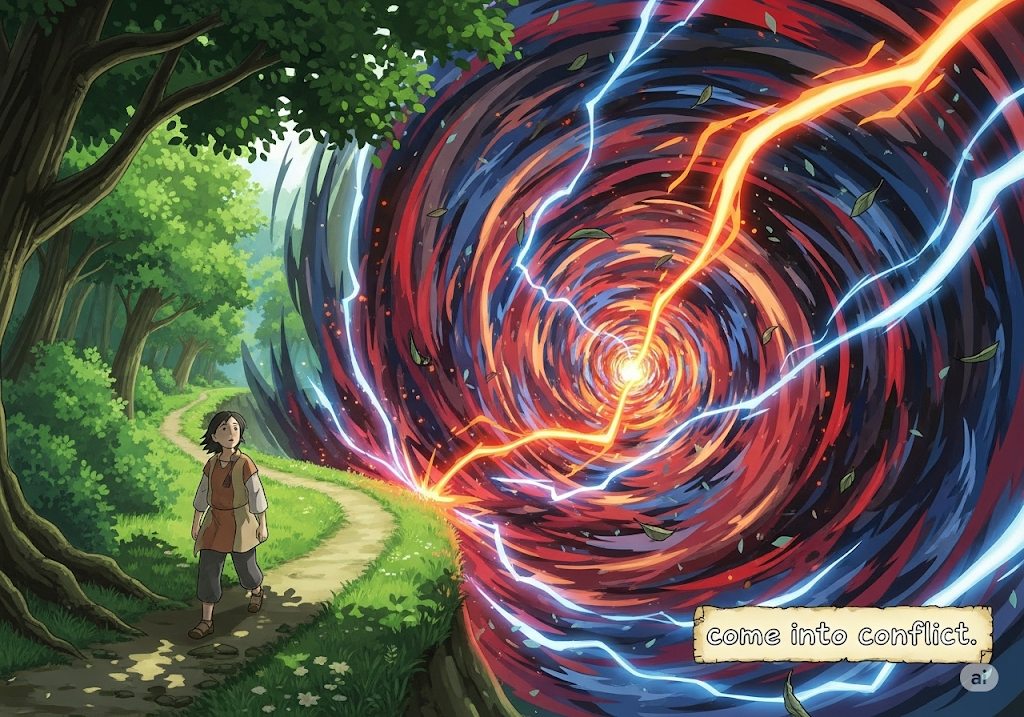 | come into | ~하게 되다, ~에 들어가다 | 동사구로, 어떤 '상태'나 '상황'에 '진입하는' 행위. | 'conflict'라는 '갈등'의 '상태'로 '들어가게 되는' 행위를 나타냄. |