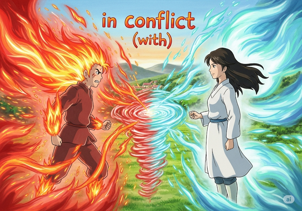 두 사람(person), 집단(group), 또는 아이디어(idea)가 '심각하게' **'대립'**하거나 **'상충'**하는 상황을 의미합니다. 단순히 '의견 불일치(disagreement)'를 넘어, 적대적인 감정(emotion)이나 무력(armed) 충돌로 이어질 수 있는 상황에 초점이 맞춰져 있습니다. 핵심은 대립과 불화입니다.