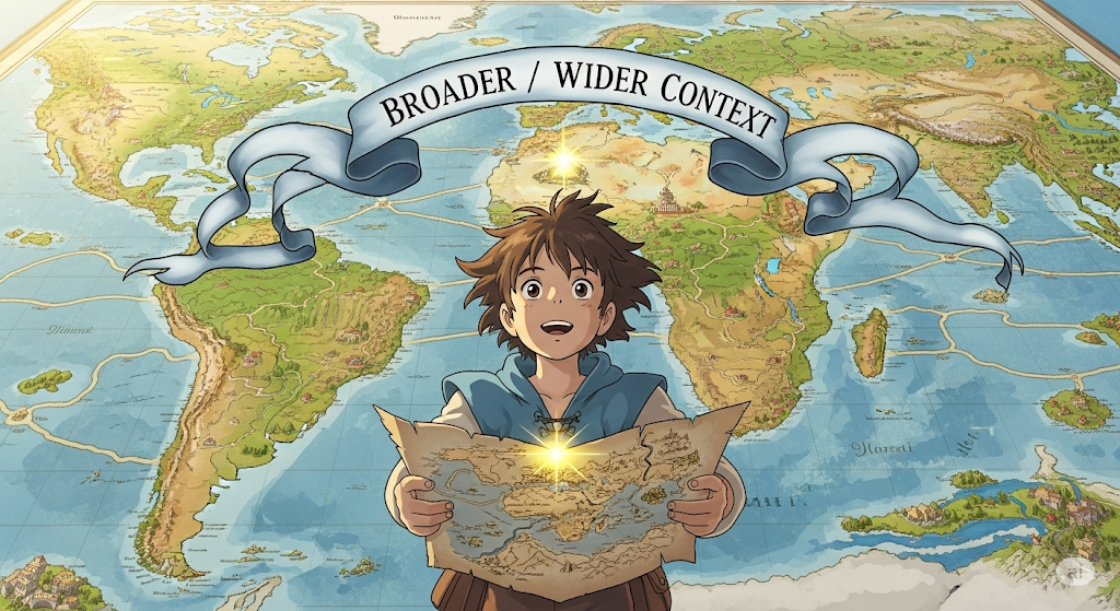 broader / wider context [ˈbrɔːdər / ˈwaɪdər ˈkɑːntekst]