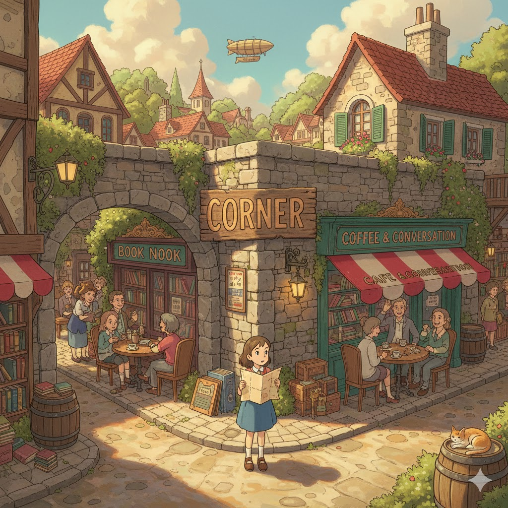 - (명사) 골목, 길모퉁이: 길이나 블록이 꺾이는 지점.