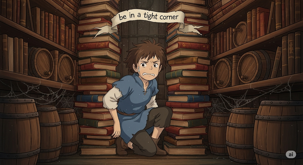 뉘앙스: "빠져나갈 곳이 없는 좁은 모퉁이에 갇힌 것처럼, 어렵고 난처한 상황에 처했다"는 것을 의미합니다. 물리적으로 갇힌 상태가 비유적으로 사용되어, 곤경에서 벗어나기 힘든 막다른 상황에 놓인 느낌을 강조합니다.