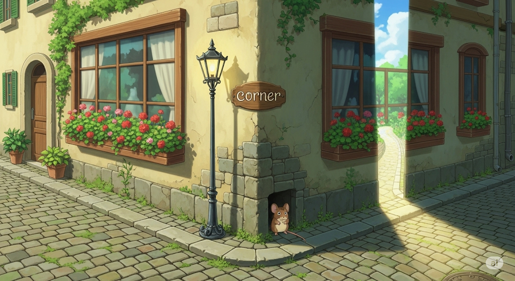 corner [ˈkɔːrnər] 공간의 끝, 숨겨진 장소의 느낌도 있음
