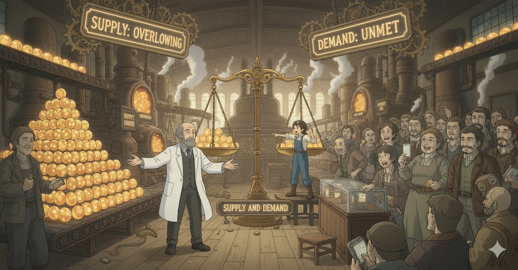 시장(market) 경제를 이루는 '가장 기본적인 개념'(basic element)으로, '상품'(goods)이나 '서비스'의 '가격'(price)을 결정하는 '판매량'(supply)과 '소비자의 필요'(demand) 사이의 **'상호작용'**을 의미합니다. 이는 '경제학'(economics)의 '핵심 **원리'**입니다.