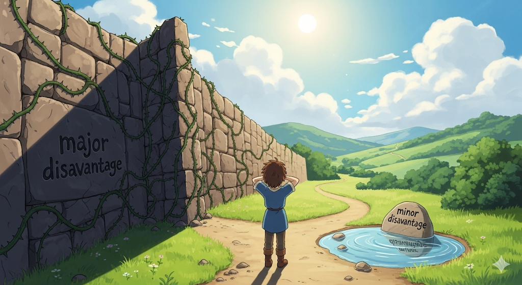 어떤 상황에서 다른 사람이나 사물보다 불리한 위치에 놓이게 하는 조건이나 특징을 의미합니다. '장점(advantage)'과 반대되는 개념으로, 성공이나 목표 달성을 방해하는 **'불이익'**이나 **'약점'**에 초점을 맞춥니다.