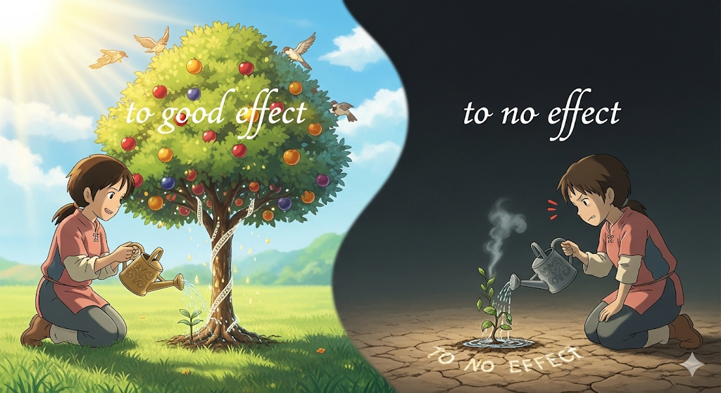 어떤 행동, 노력(effort), 또는 수단(instrument)이 '원하는 긍정적인 결과'(good effect)를 낳았는지(to good effect) 아니면 '전혀 결과를 낳지 못했는지'(to no effect)를 평가할 때 사용됩니다. 이는 '행위의 효율성'(efficiency)에 초점이 맞춰져 있습니다.