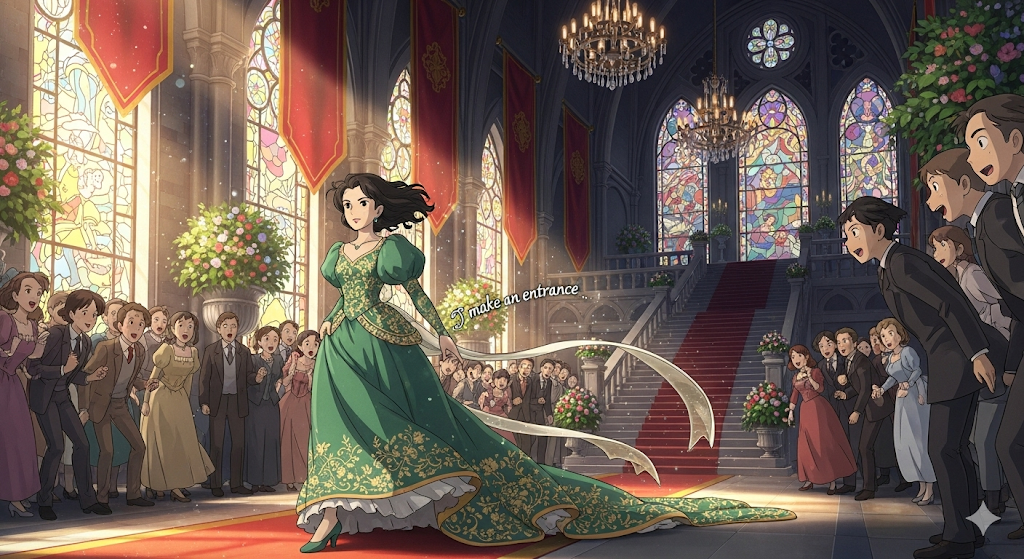 - 예문: She made a grand entrance at the party in a beautiful dress.