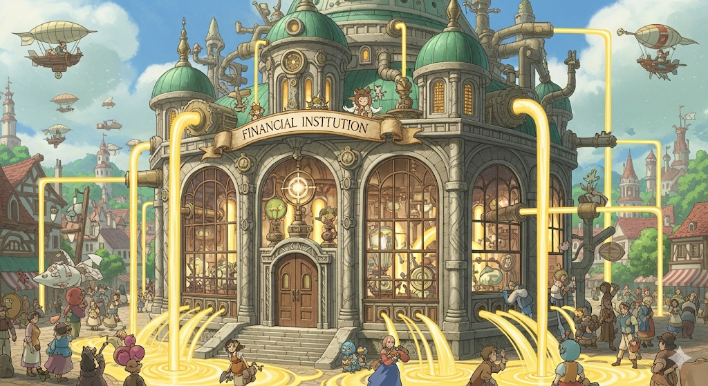 재정(finance) 관련 업무(business), 예금, 대출, 투자(investment) 등을 주된 기능(function)으로 하는 조직(institution)을 의미합니다. '은행, 증권사', 또는 '보험사' 등 돈의 흐름을 다루는 공식적인 **회사'**에 초점이 맞추어져 있습니다.