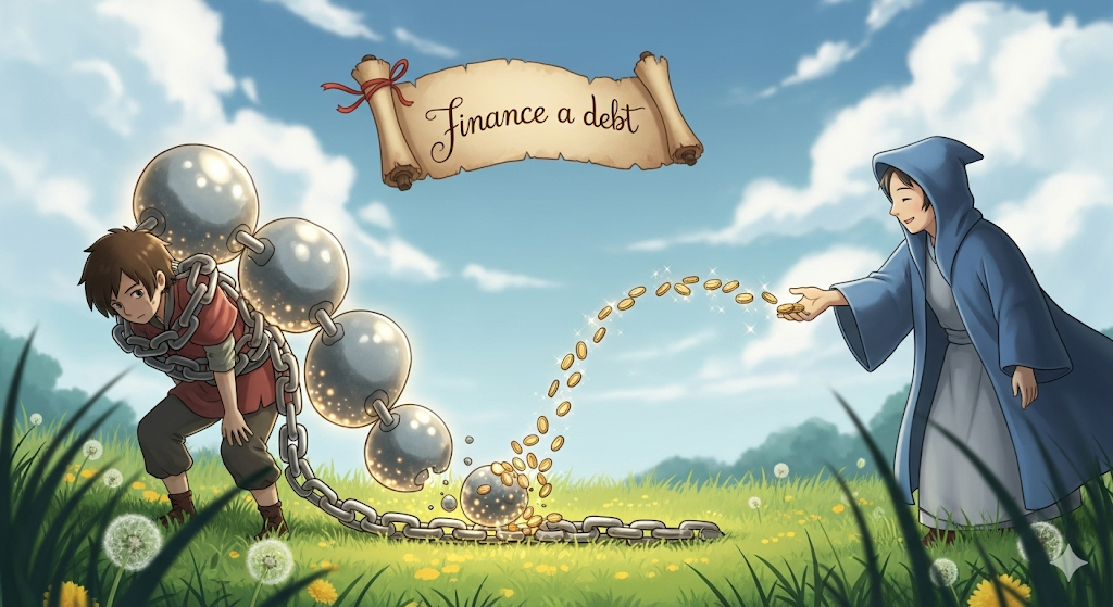이미 발생했거나 발생할 예정인 '빚'(debt)이나 '채무'를 갚거나 재조정하기 위해 '추가적인 돈'(finance)을 '새로 마련하는 **행위'**를 의미합니다. '채무 상환을 위한 자금 **조달'**에 초점이 맞추어져 있으며, 종종 '새로운 **대출'**을 의미합니다.