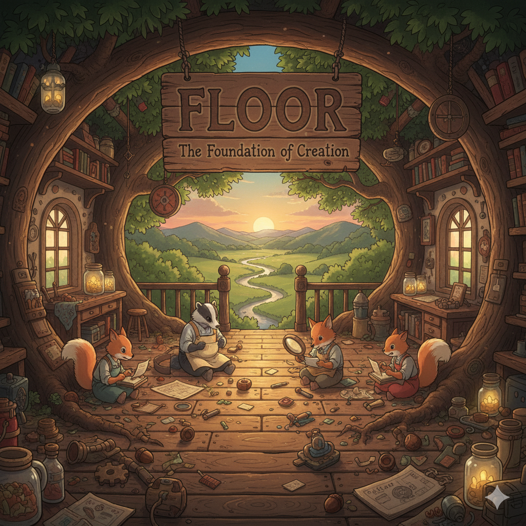 고대 영어 flōr ("바닥, 지면")에서 유래 → 게르만어 계열에서 '평평한 바닥'을 의미하는 단어와 연결 → 즉, 원래 **'방의 가장 낮은 표면'**을 의미했음 → 이 의미가 현대 영어에서 '건물의 바닥' (바닥) 명사로 굳어졌어요. 나아가 건물의 높이와 관련되어 '건물의 층' (층)의 의미를 가지게 되었고, '회의장에서 발언하는 곳'이라는 의미에서 **'(회원, 대표 등의) 발언권'**으로 확장되었어요. 또한, '가장 낮은 곳'이라는 비유적 의미에서 **'최저한도, 최저선'**의 의미를 가지게 되었어요.
