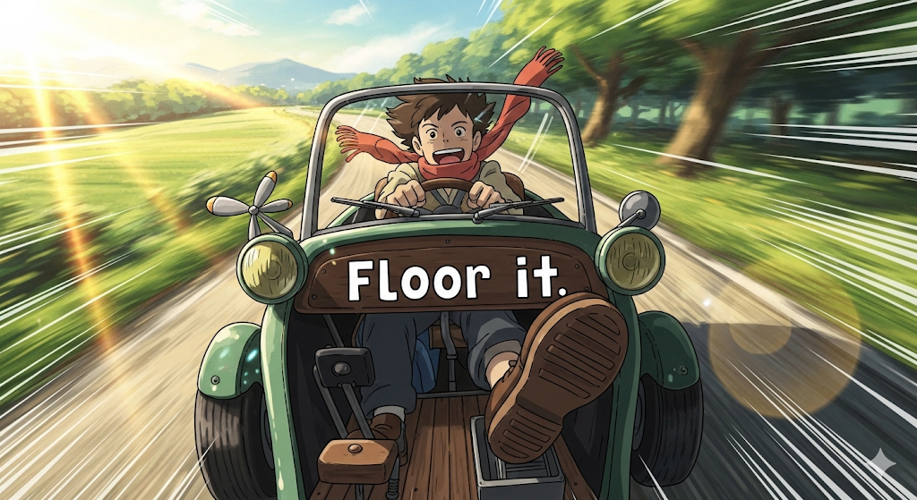 - 해석: (차, 기계를) 최고 속도로 돌리다, 급가속하다